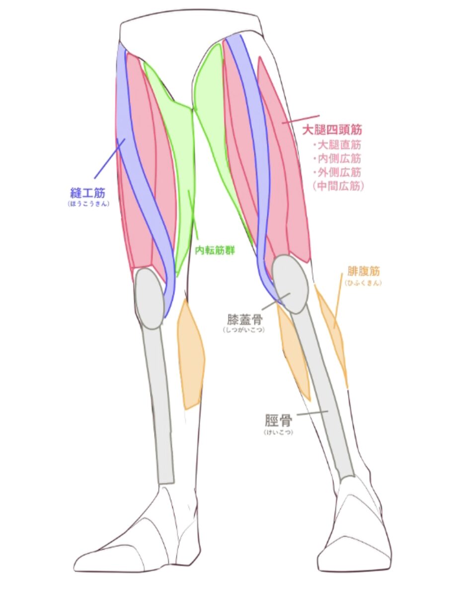 大腿四頭筋(だいたいしとうきん):太ももの前面にある、非常に大きく強力な筋肉です。膝を伸ばす動作に使われます。イラストでは、太ももの前面の大きな膨らみとして表現されます。