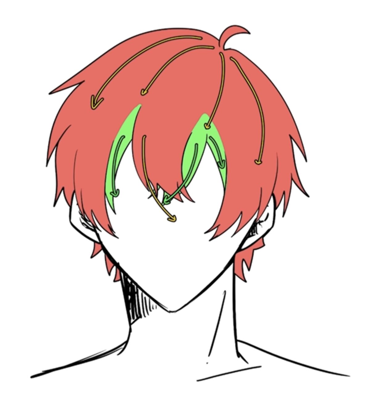 - 後ろの毛束(緑):まず、奥側にある毛束(M字の谷間の部分)を描きます。これはキャラクターの額に比較的近い部分です。